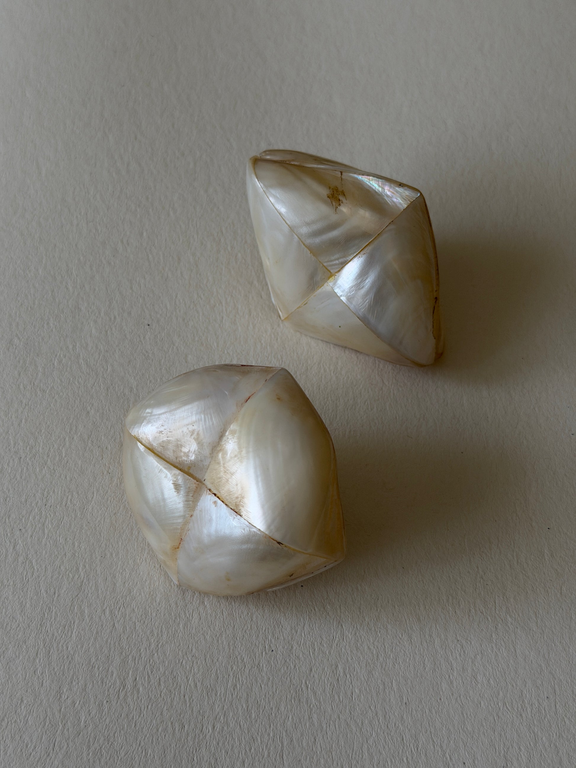 A pair of vintage salt and pepper shakers carved from luminous mother-of-pearl. Each piece reflects soft, iridescent tones, making them both functional objects and subtle decorative accents.